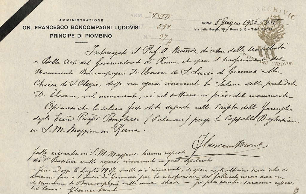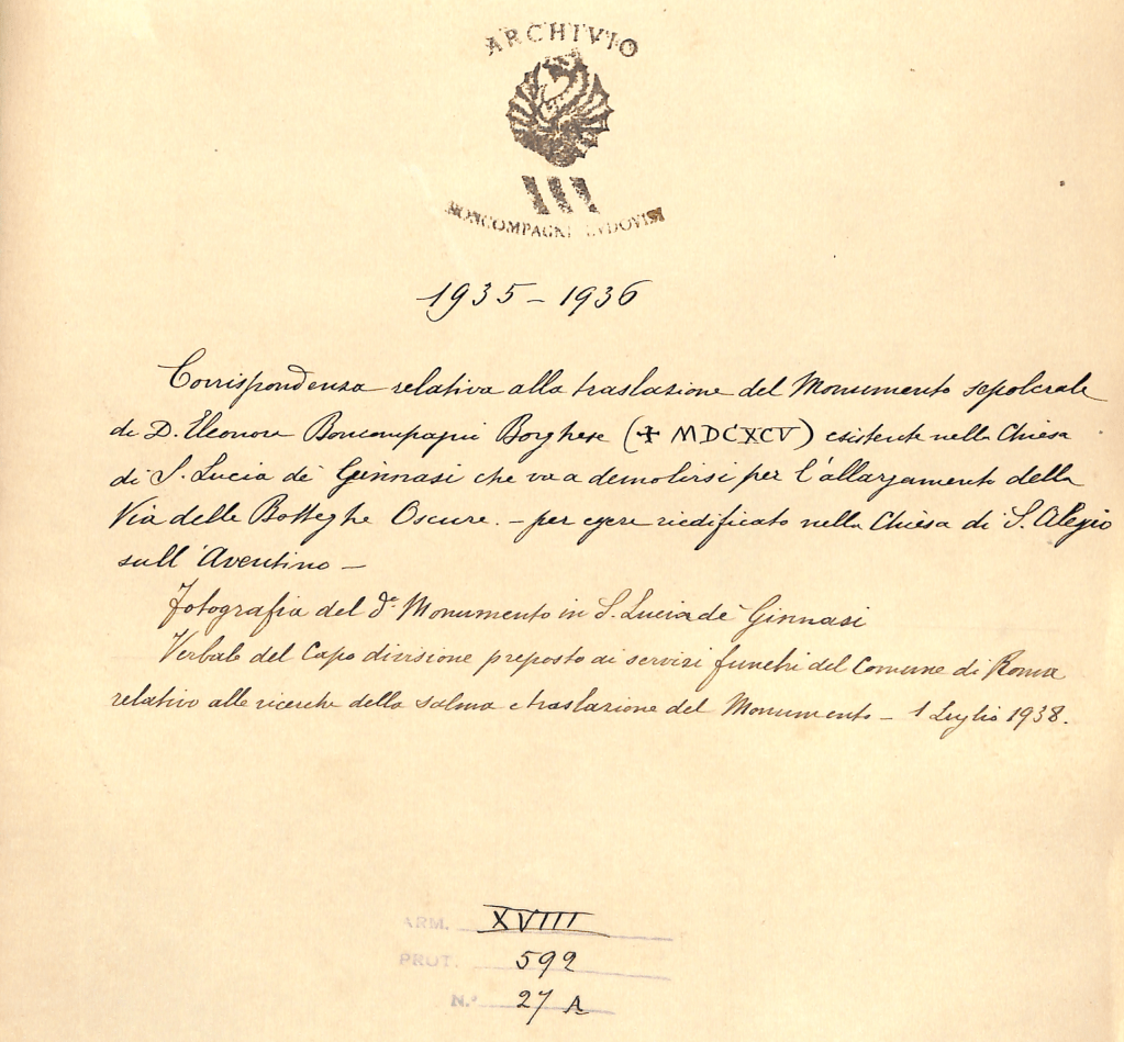 Prince Francesco Boncompagni Ludovisi understandably wanted to save his ancestor Eleonora’s monument from being destroyed with the rest of the church of S Lucia de’ Ginnasi. Therefore, the ex-Governor forcefully expressed his desire for the monument to be relocated to a different church and communicated this idea to the Director of Fine Arts by letter.