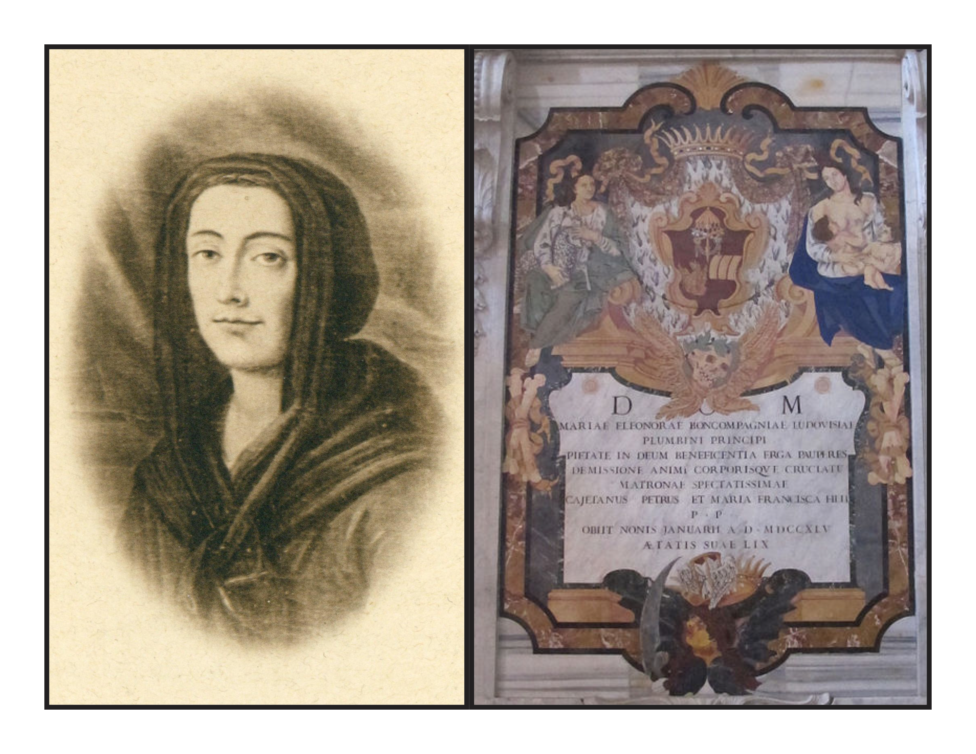 Portrait of Eleonora Boncompagni Ludovisi (Sora 1686—Rome 1745), in the habit of a widow, following the death of her husband Antonio (I) Boncompagni (†1731) [collection HSH Princess Rita Boncompagni Ludovisi, Rome]; and her tomb monument in the church of S Maria del Popolo [Wikimedia Commons]