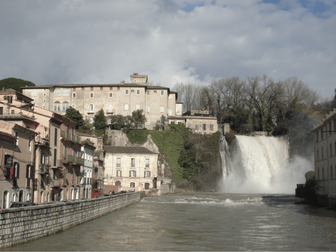 Contemporary view of Isoa del Liri, with ex-Boncompagni palace at upper left, now known as Castle Boncompagni Viscogliosi [Wikimedia Commons]