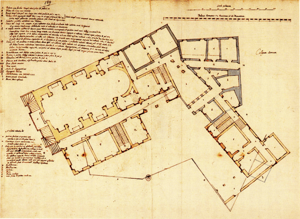 Bellisario provides the approved first plan of the Jesuit College at Sora, dating back to 1611—still during the lifetime of the papal son Giacomo Boncompagni. The college only later expanded to incorporate the surrounding areas, which were once home to gardens belonging to neighboring religious communities. In its developed form, the Jesuit College consisted of a palazzo housing both educational facilities and the residence of the Jesuit Fathers, accompanied by the adjacent church of S Spirito.