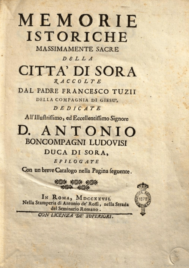 Tuzi in his biographical notice of Luigi Bizzarri offers many items of direct relevance to this letter. He describes how Bizzarri energetically combined “spontaneous” teaching with spiritual work, at the school and in the general territory of Sora. He reports that Bizzarri affected the guise of a beggar and “always mortified himself daily with disciplines, hair shirts, and iron chains”, until the Jesuits eventually made him stop. “In his old age, suffering great harm from sitting still in the confessional” due to sciatica, “he would remain immobile for five continuous hours.” He also convinced many of the people of Sora that his intercession is what protected them from droughts or floods. Tuzi also says that Bizzarri “regularly assisted the Noble Duchess”, i.e., Maria Ruffo Boncompagni, “always responding to any call to the Ducal Palace of the Isola [del Liri].”