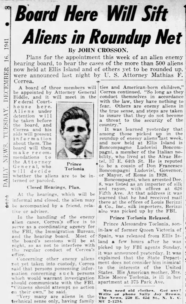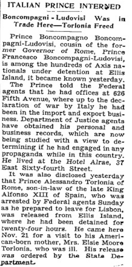 In New York City, Boncompagno lodged since later 1938 at the Alrae Hotel on 37 East 64th Street, and maintained an office at 626 Fifth Avenue, where he mainly focused on the import/export business, with a specialty in silk and rayon. However on 16 December 1941, days after Japan’s attack on Pearl Harbor and America’s declaration of war on the Axis powers, Boncompagno found himself amongst the hundreds of Axis nationals who were arrested and detained on Ellis Island.