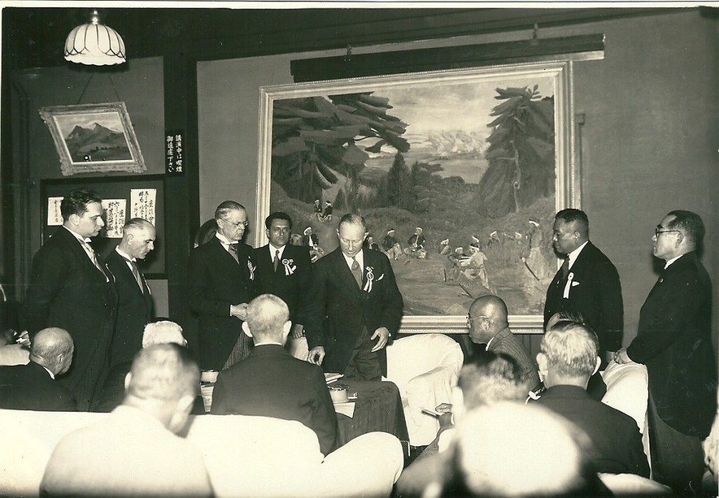 The May-June 1938 Italian Economic Mission to Japan, with Boncompagno Boncompagni Ludovisi (standing third from left) with Italian and Japanese industrialists. Credit: Wikimedia Commons