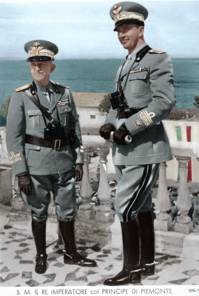 King Vittorio Emanuele III with his son Umberto, the Prince of Piemonte., ca. 1944 On 5 June 1944, the day after the Liberation of Rome, the King made his son de facto head of the Kingdom, naming him Lieutenant General of the Realm. Credit: Arkivi UG