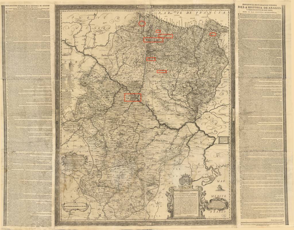 A marked map of Aragon by Joan Baptista Labaña (1555-1624, but published in 1777) that contains many of the place names mentioned in King Philip’s letter; Labeled in red are the city of Jaca (spelled Iaca), Huesca, Zaragoza (spelled Çaragoca), Ayerve (spelled Ayerbe), Santa Helena (as St. Elena), Campfranc (as Canfranc), Ansó, and Benasque (spelled Venasque). Credit: Biblioteca Digital Real Academia de la Historia