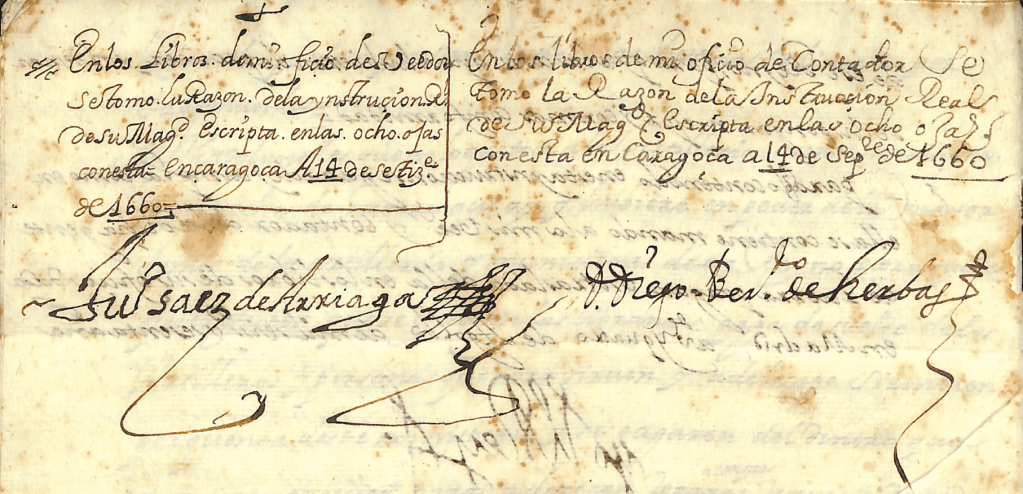 Notation on verso of the last page of a 1660 letter of King Philip IV to Niccolò Ludovisi: “In the books of my office as Accountant, the record was taken of His Majesty’s royal provision, and it was written on the eight leaves, including this one, in Zaragoza on the 14th of September, 1660”. Image courtesy of HSH Princess Rita Boncompagni Ludovisi, Rome
