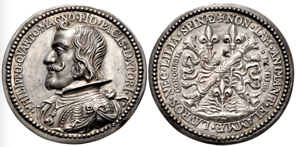 Bronze medal of 1660 from the Spanish Netherlands (by Adrien Waterloos), commemorating Philip IV’s signing the Treaty of the Pyrenees with France. On the obverse the king wears the collar of the Order of the Golden Fleece. Credit: Classical Numismatic Group