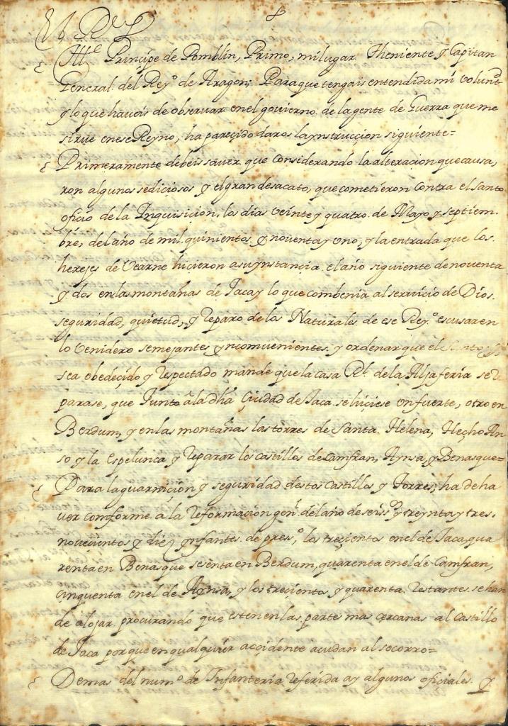 [on page 15 of the document below] Instruction to be observed by the Prince of Piombino in the exercise of the office of Captain General of the Kingdom of Aragon
