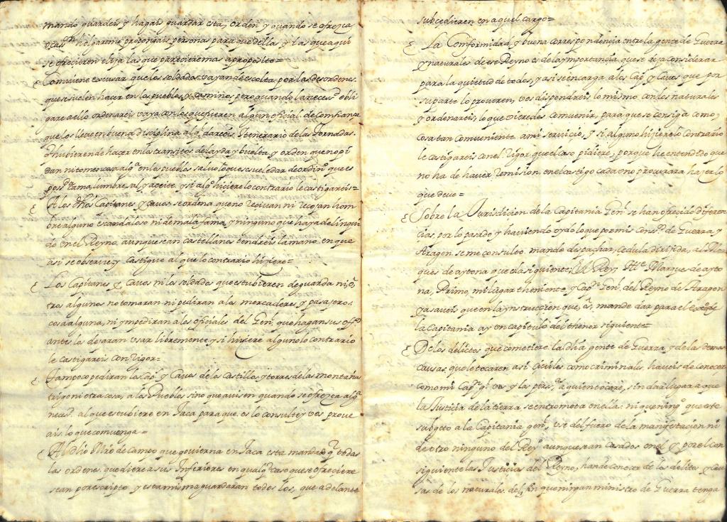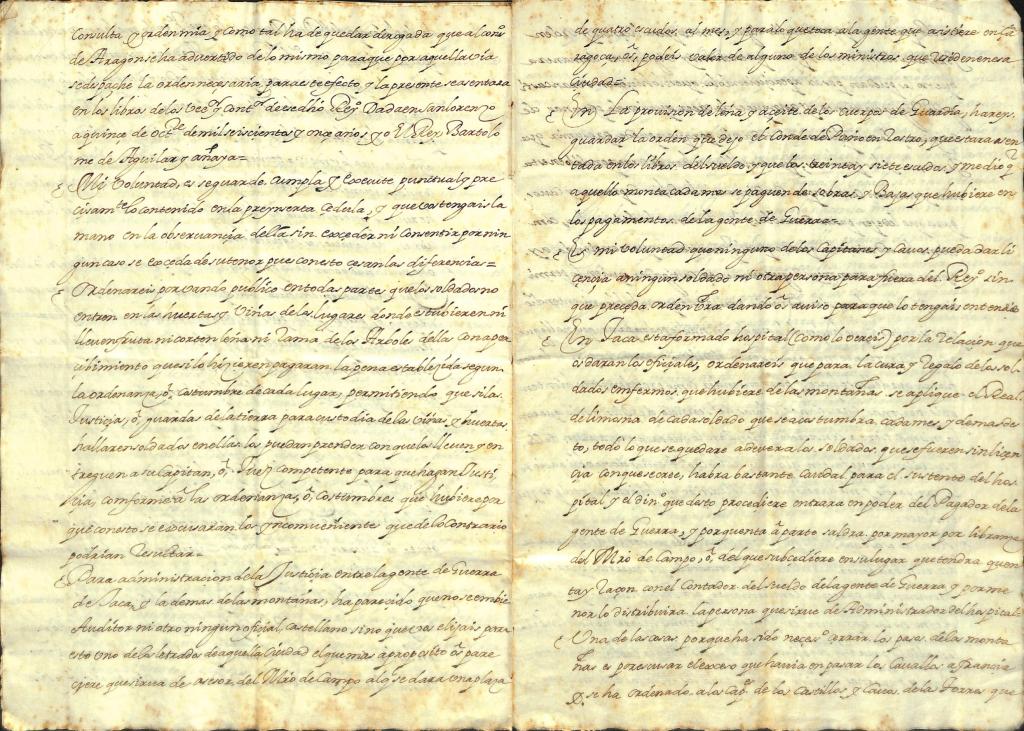 After reviewing everything in my War Council, including papers [9] dating back to the Duke’s time, and after further consultation with both my War and Aragon Councils, I have resolved that the disputes must end, and that it be permanently settled what belongs to the Captain General’s jurisdiction. Offenses must be punished, and clarity established about what pertains to the captaincy, all without infringing upon local law, so that justice may be administered without obstruction.