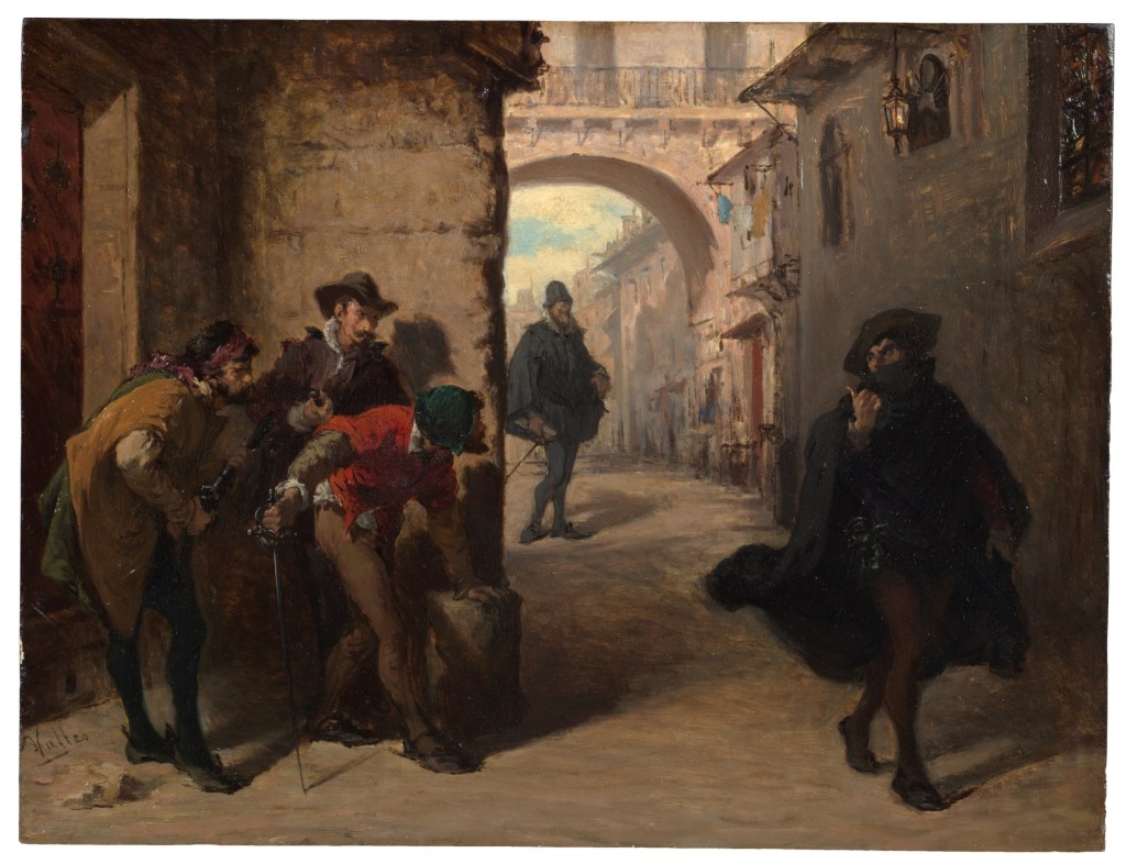 Lorenzo Vallés (1830-1910), Death of Juan de Escobedo (ca. 1879). The painting shows the moment before the statesman’s assassination in the Callejón de la Almudena in Madrid on 31 March 1578. Credit: Museo del Prado