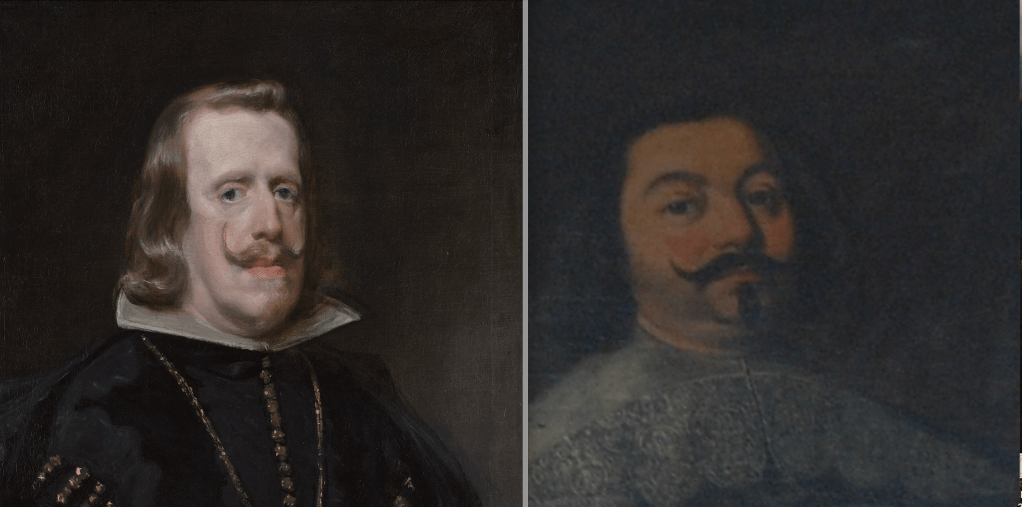 Left: Diego Velázquez (1599–1660), detail of portrait of Philip IV of Spain (1656). Credit: National Gallery, London / Wikimedia Commons. Right: detail of portrait by unknown artist of Niccolò Ludovisi in Casino dell’Aurora, Rome. Credit: HSH Princess Rita Boncompagni Ludovisi.