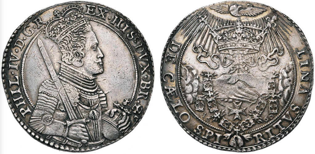 Silver medal, undated (1660), Antwerp (?), commemorating the Peace of the Pyrenees between Spain and France. Obverse: Crowned bust of Philip IV. Reverse: legend DE CAELO SPIRITVS VNIT (“the Spirit unites from Heaven”); beneath the dove of the Holy Spirit, two clasped hands, from which hangs the collar of the Order of the Golden Fleece. Credit: Jean Elsen & ses Fils