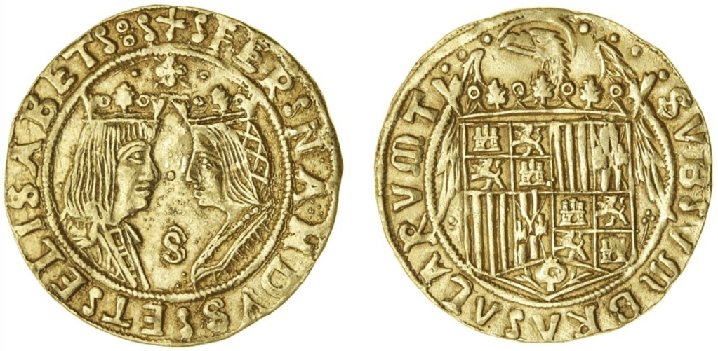 Spain (Seville mint, undated), Double Excellente, Ferdinand and Isabella (reigned 1479-1504). Obverse legend: FERNANDVS ET ELISABET. Reverse legend: SVB VMBRA ALARVM T(uarum) (“under the shadow of your wings”). Credit: Spink