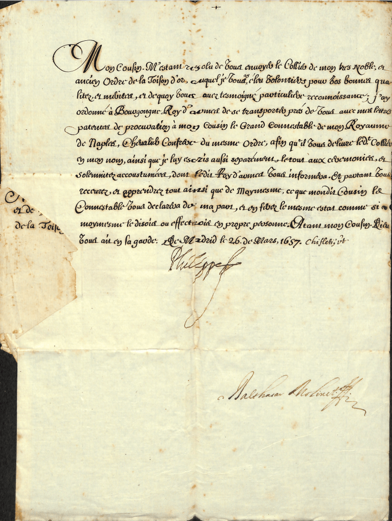 Archivio Boncompagni Ludovisi prot. 4 no. 8, letter (26 March 1657) of Philip IV of Spain to Niccolò Ludovisi, informing him of his grant of the collar of the Order of the Golden Fleece. Credit: HSH Princess Rita Boncompagni Ludovisi, Rome.