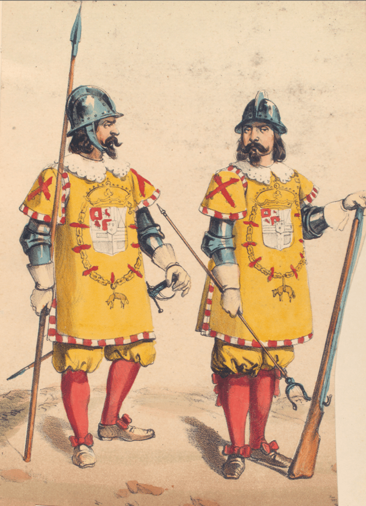 Piquero; Mosquetero. Regimiento de Guardias de infanteria de Felipe IV. Casa real (1660) = Pikeman; Musketeer. Regiment of Infantry Guards of Philip IV. Royal Household. Credit: The Vinkhuijzen collection of military uniforms, New York Public Library.