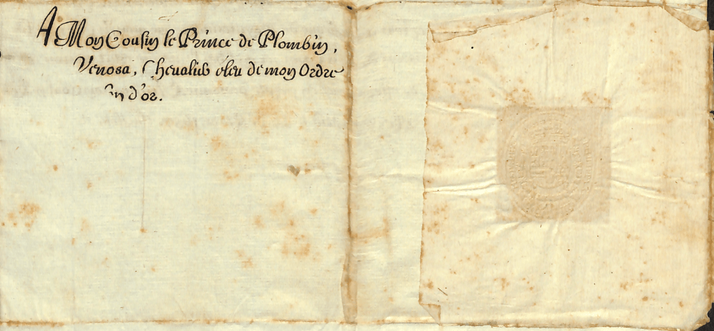Verso of Archivio Boncompagni Ludovisi prot. 4 no. 8, letter (26 March 1657) of Philip IV of Spain to Niccolò Ludovisi, informing him of his grant of the collar of the Order of the Golden Fleece. Credit: HSH Princess Rita Boncompagni Ludovisi, Rome.