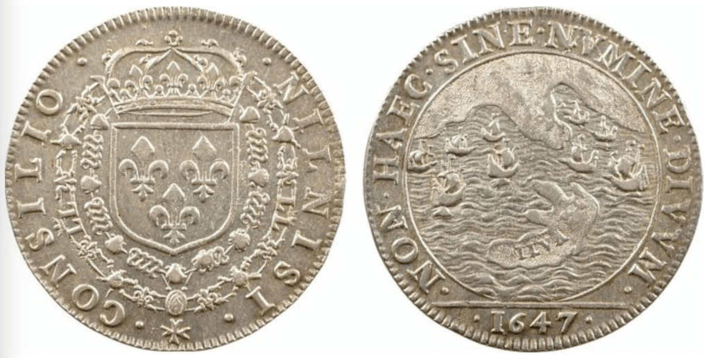 Silver French écu (1647) minted under Louis XIV commemorating the capture of Porto Longone on the island of Elba. Obverse: legend NIL NISI CONSILIO (“nothing without planning”) surrounding crowned shield of France encircled by the double collar of the Orders of Saint Michael and of the Holy Spirit. Reverse: legend NON HAEC SINE NUMINE DIVUM (“nor these events without the divine power of the gods”), surrounding a fleet of nine ships that attacks an island inscribed ILVA (Elba). Credit: iNumis