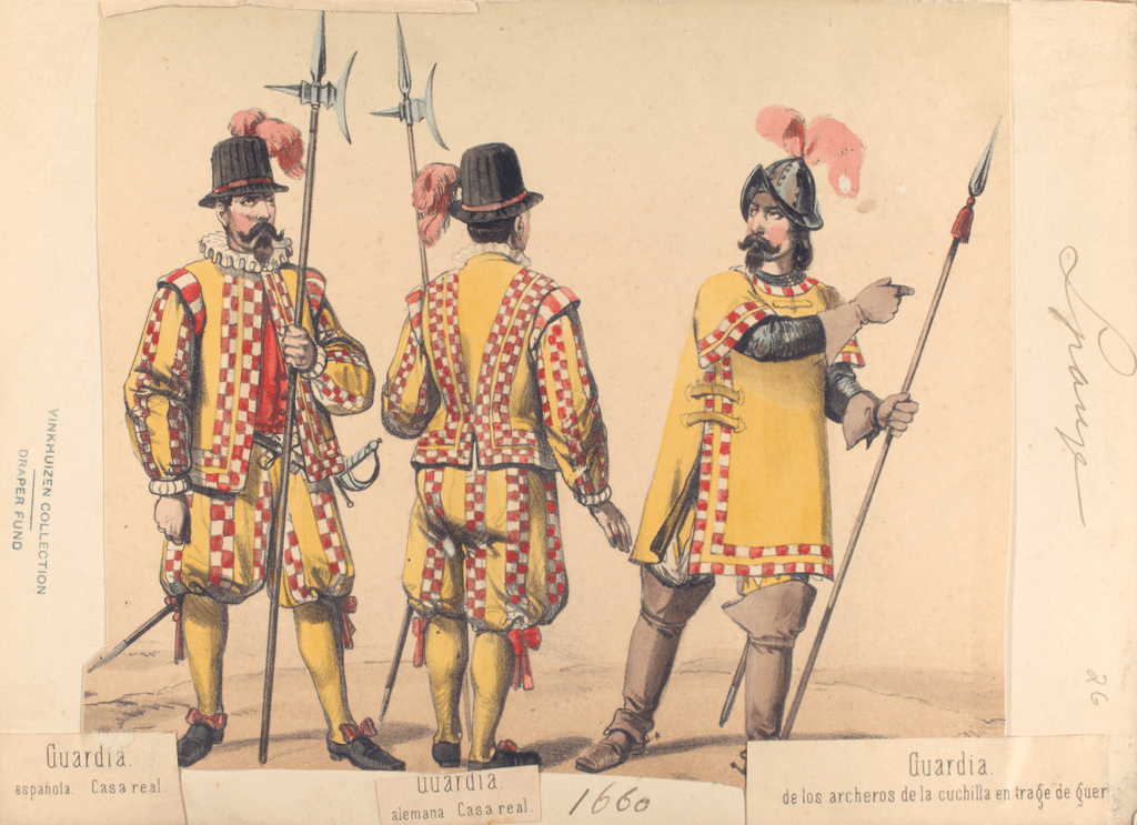 Guardia española, Casa real; Guardia alemana Casa real; Guardia de los archeros de la cuchilla en traje de guerra (1660). Credit: The Vinkhuijzen collection of military uniforms, New York Public Library.