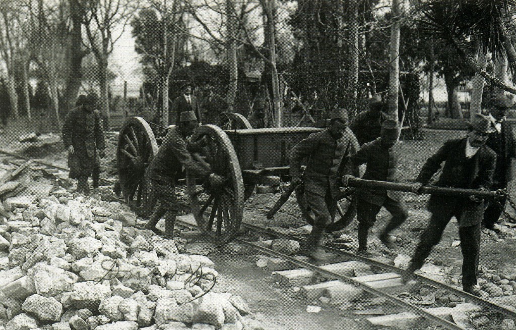 Durrës (May or June 1914): Albanian soldiers and civilians hauling artillery. Credit: Marquis di S Giuliano Photo Collection