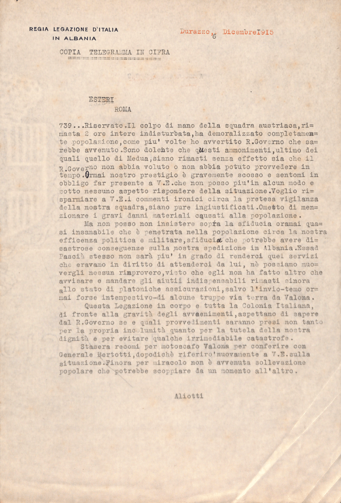 This telegram is noteworthy for a few reasons. It is situated almost directly in the middle of Baron Aliotti’s career, presumably at the height of his influence. It has been sent in code, noted by “in cifra” (“encrypted”), underlining the high tension of the situation in Albania and instability of the Italian mission. Regarding the main issue of the telegram, the surprise attack by the Austrian squadron, Aliotti takes no responsibility for the events that have occurred. Most importantly, it places Aliotti firmly in Albania in December 1915, a full year later than his own biographer in the Treccani encyclopedia claims he departed from the region.
