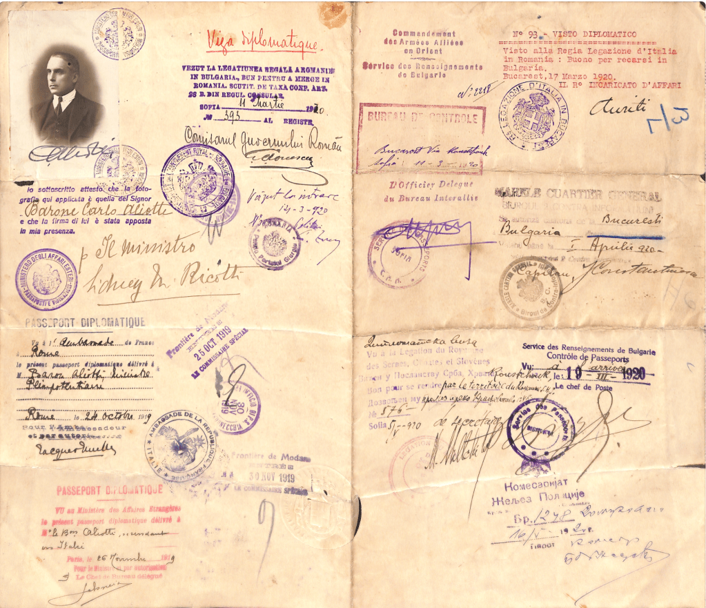 Diplomatic passport pages (1919-1920) of Baron Carlo Alberto Aliotti, 1870-1923. Courtesy of HSH Princess Rita Boncompagni Ludovisi.