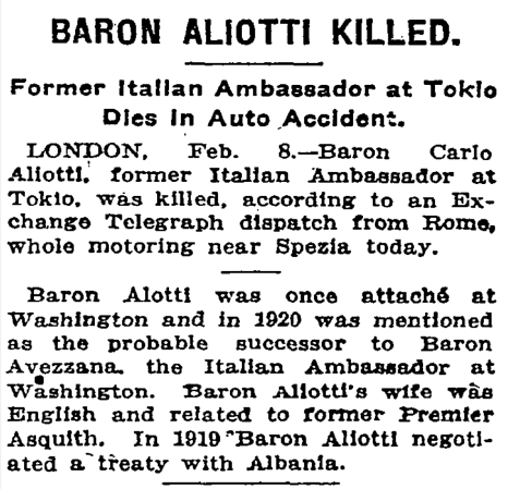 Aliotti was fired from his position in Tokyo by the newly appointed Italian prime minister and leader of the Fascist party, Benito Mussolini (1883-1945), in November 1922. Shortly afterward, on 8 February 1923, he perished suddenly in an automobile accident in Italy near La Spezia. It is hard not to suspect that Mussolini was somehow involved, as the prime minister was working at the time on removing political opposition and dismantling democracy as he sought to appoint himself dictator. Additional research into the final years of Aliotti’s career, specifically during his role as minister to Tokyo, may further illuminate his political position at the time and clarify if he may have been a target of Mussolini and his Fascist party.