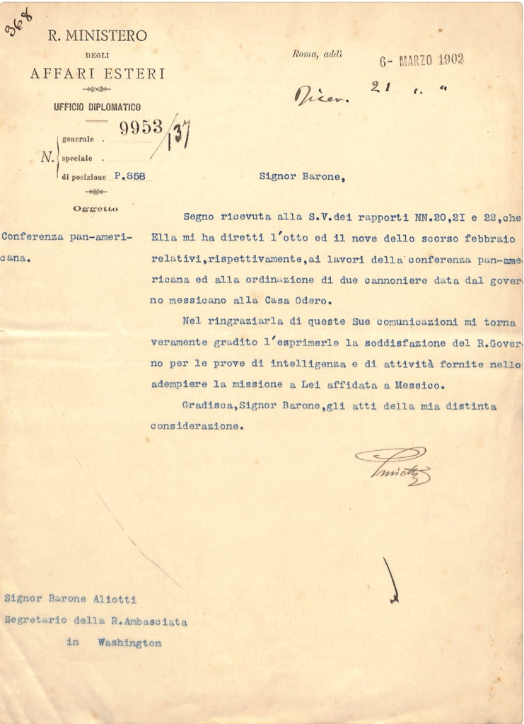 Letter (6 March 1902) to Aliotti, then based in Washington DC, from Giulio Prinetti (1851-1908), Italian Foreign Minister 1901-1903. In 1939 Aliotti’s daughter Bonacossa (1908-1995) would marry Prinetti’s grandson Gregorio Boncompagni Ludovisi (1910-1988), and soon be parents of HSH Prince Nicolò Boncompagni Ludovisi (1941-2018). Courtesy of HSH Princess Rita Boncompagni Ludovisi.