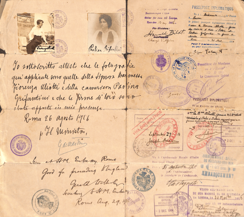 Diplomatic passport pages (1916) of Baroness Esther Florence (Fiorenza) Aliotti (née Vignoles), 1870-1944. After her husband’s death in an auto crash she competed as a race car driver, finishing second (of 14) in the 1932 Paris-Rome Rallye Feminin, in which she drove an Alfa Romeo. Courtesy of HSH Princess Rita Boncompagni Ludovisi.