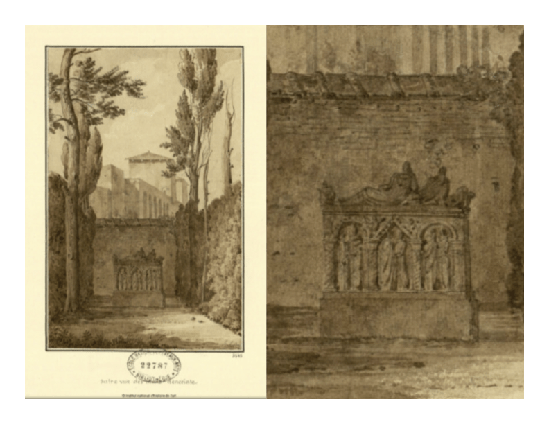 Above: large columned sarcophagus (Schreiber 212) with dextarum iunctio scene and poorly-carved inscription (CIL VI 28358 – 31593), commemorating Varia Octabiana (sic) and Aurelius Theodorus. Image: Clauss-Slaby. Below: 1806 sketch of sarcophagus with mismatched lid (Schreiber 213) by Louis-Hippolyte Lebas (1782-1867). Credit: L’École Nationale Supérieure des Beaux-Arts