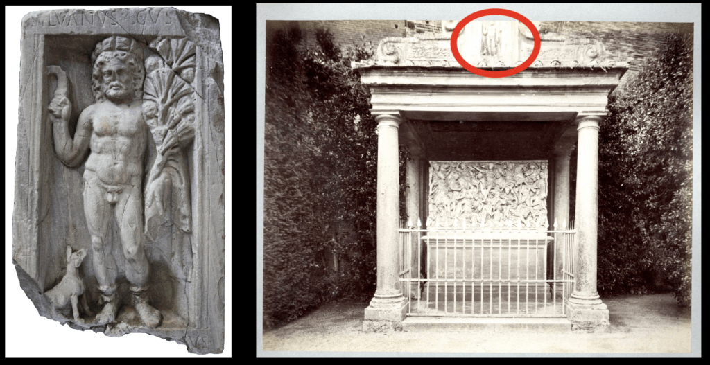 Relief (Schreiber 187) with inscription (CIL VI 640) to the rural god Silvanus, once embedded in an aedicula above the Great Ludovisi Battle Sarcophagus, placed against the Aurelian Wall below the 3rd tower east of Porta Pinciana. Image at left: TC Brennan. Image at right: Prince Ignazio Boncompagni Ludovisi (1845-1913), taken in 1885.