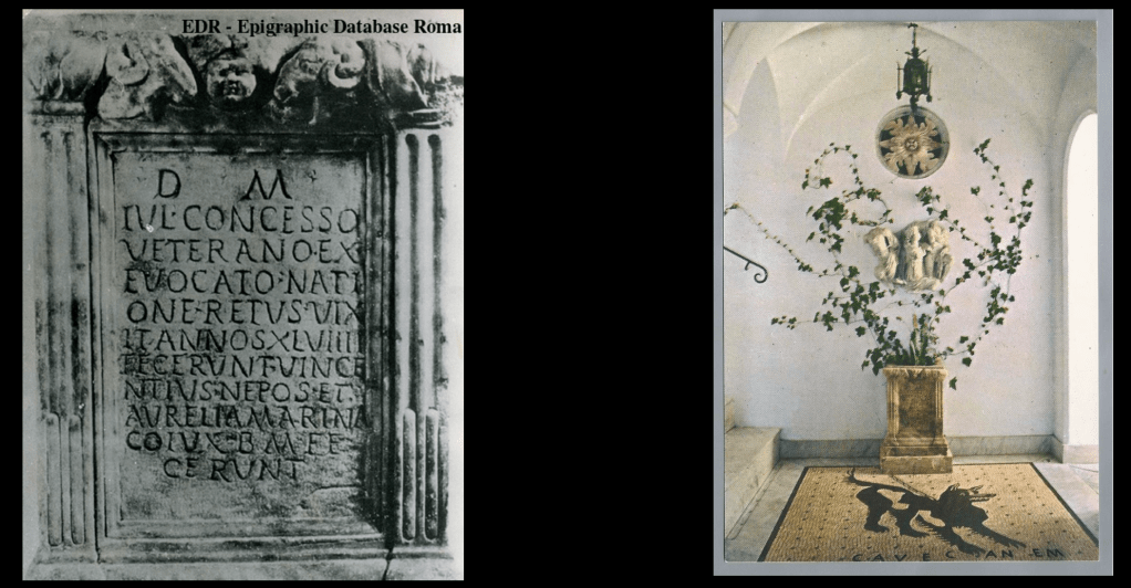 Image from Epigraphic Database Roma of CIL VI 3430 (funerary altar of the veteran Iulius Concessus), and postcard of the inscription in its present context at the Villa San Michele of Alex Munthe in Capri.