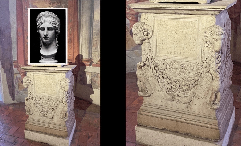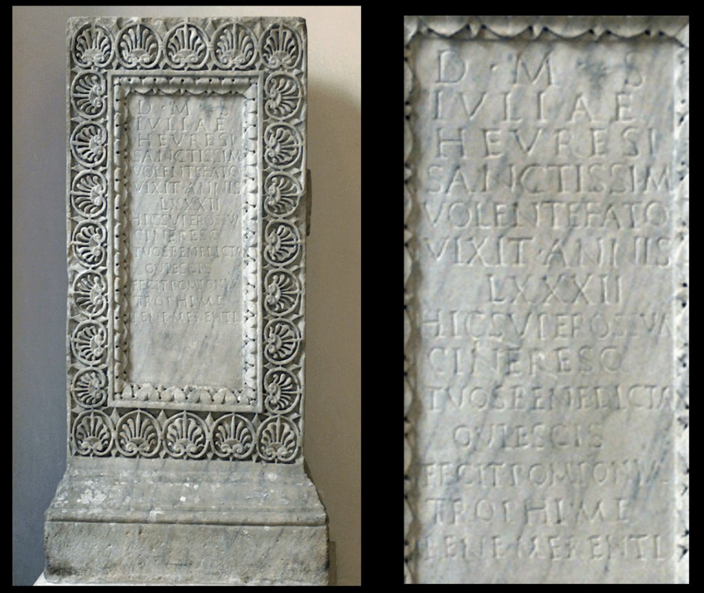 Above, from the Palazzo Altemps museum: CIL VI 20513, funerary monument of Iulia Heuresis, said to have died at age 82. Image: E. Puja. Below: image of this monument used as a base for the Giambologna Cesarini Venus in the Museo Boncompagni Ludovisi ca. 1860. Image: Grillet.
