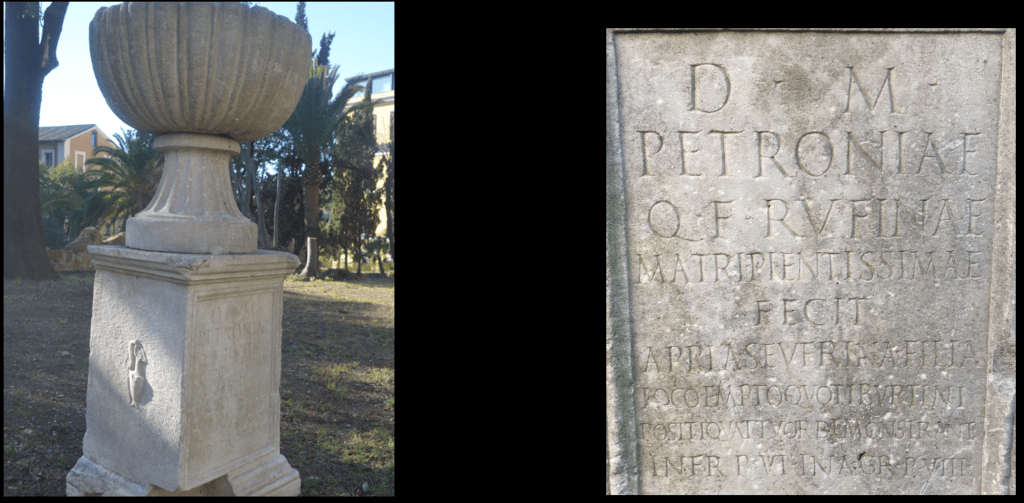 Images of funerary altar of Petronia Q.f. Rufina (Schreiber 134 = CIL VI 24047), today in garden of Casino dell’ Aurora, surmounted by vase. Images: T.C. Brennan; courtesy of HSH Princess Rita Boncompagni Ludovisi, Rome.