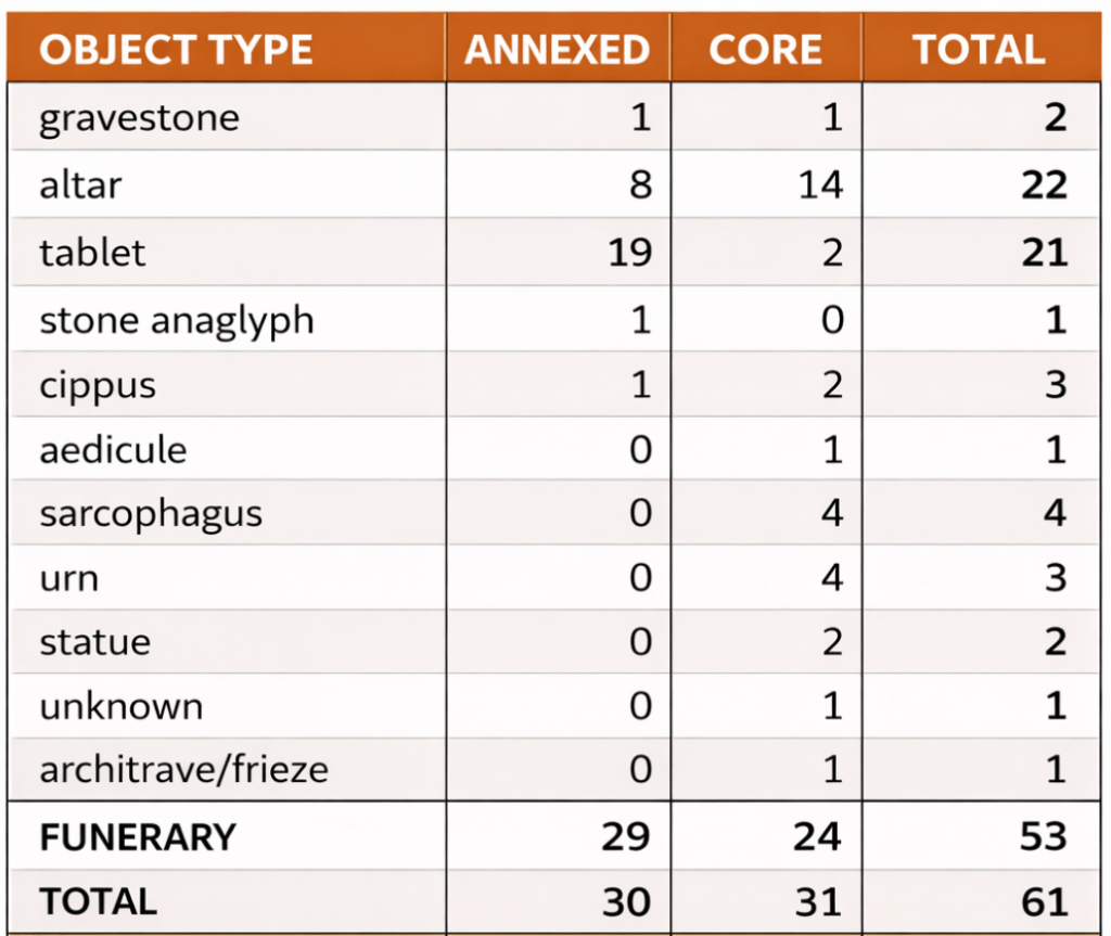 This table shows the breakdown of the inscriptions by object type, whether they are funerary objects, and whether they are from the core Ludovisi collection or annexed after 1851 from the Villa Paulsen. The number of inscriptions acquired consciously or through annexed property are nearly equal, at 31 acquired by the Ludovisi and 30 from the Villa Paulsen. Most are funerary because most surviving Roman inscriptions are funerary.