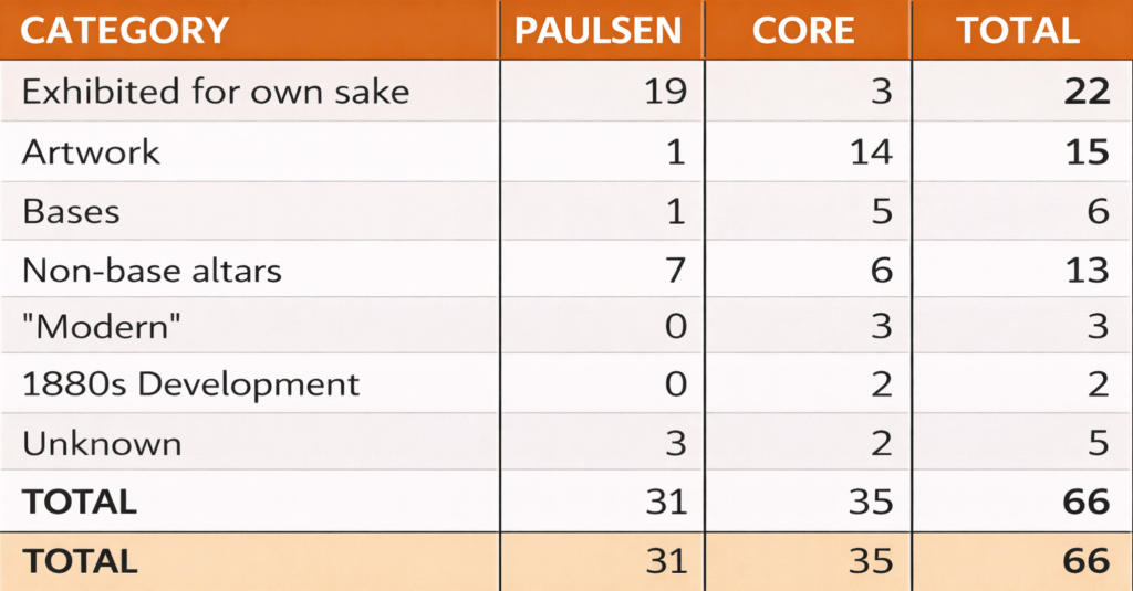This core collection contains 14 altars and just 2 tablets, in stark contrast to 19 tablets—out of 30 total inscriptions—from the Villa Paulsen collection. In fact, only three pieces displayed at Villa Ludovisi-Paulsen were remarkable enough to have been recorded by either Schreiber in 1880 or Palma in the 1980s.
